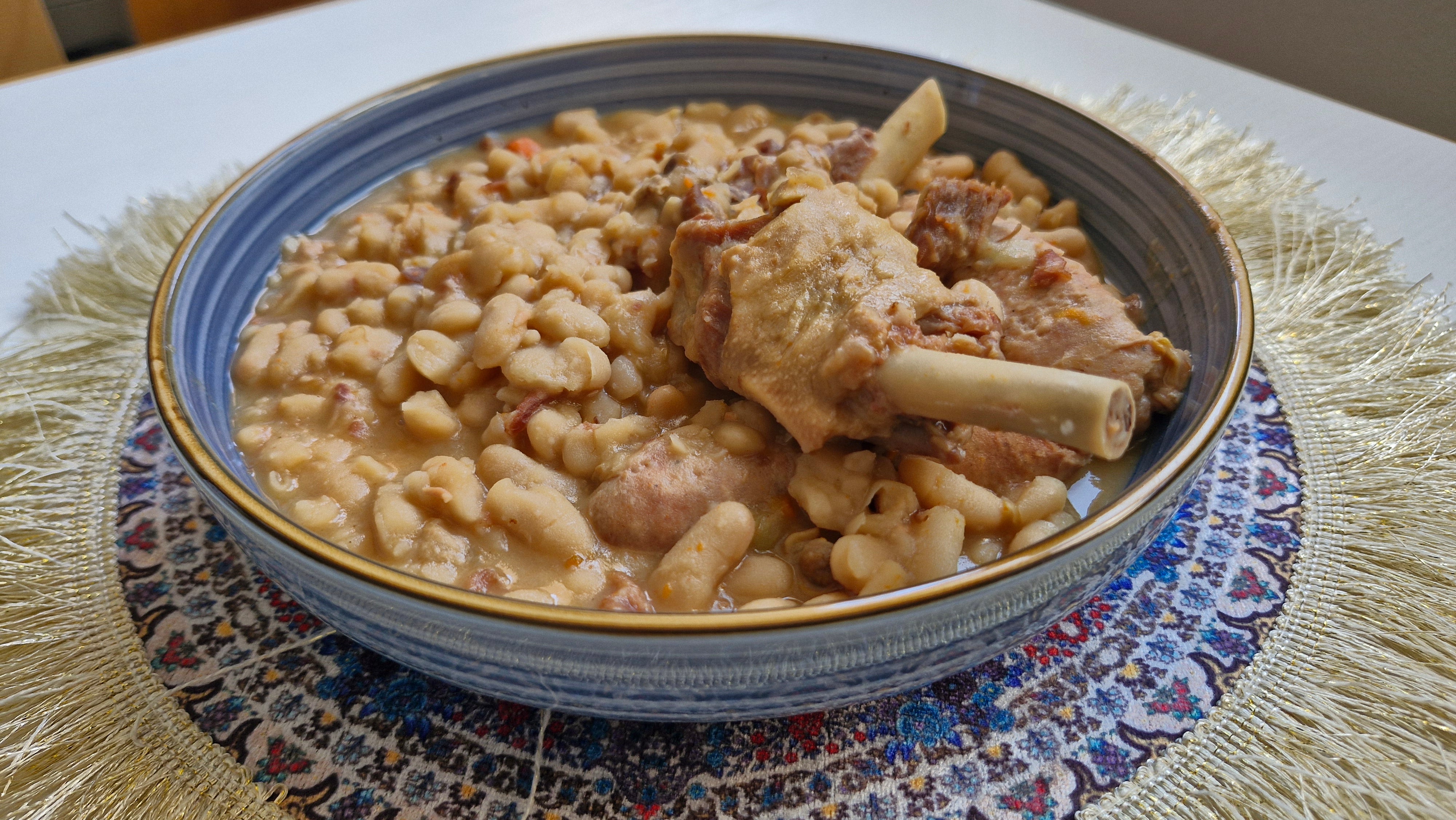 • White beans, duck leg confit, pork sausages, homemade broth (poultry bones, carrots, leeks, turnips, onions), tomato, salt, pepper, herbs.